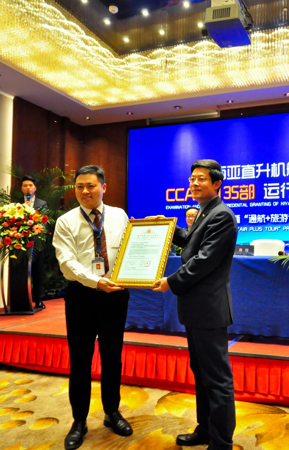 在頒證儀式上,西亞航空總經(jīng)理盛宇對公司CCAR-135部應(yīng)審情況作了匯報,民航新疆管理局飛標處副處長兼西亞航空主任運行監(jiān)察員王發(fā)中對公司CCAR-135部審定工作情況進行總結(jié)。民航新疆管理局副局長周翔向西亞航空總經(jīng)理盛宇頒發(fā)了CCAR-135《運行合格證》。