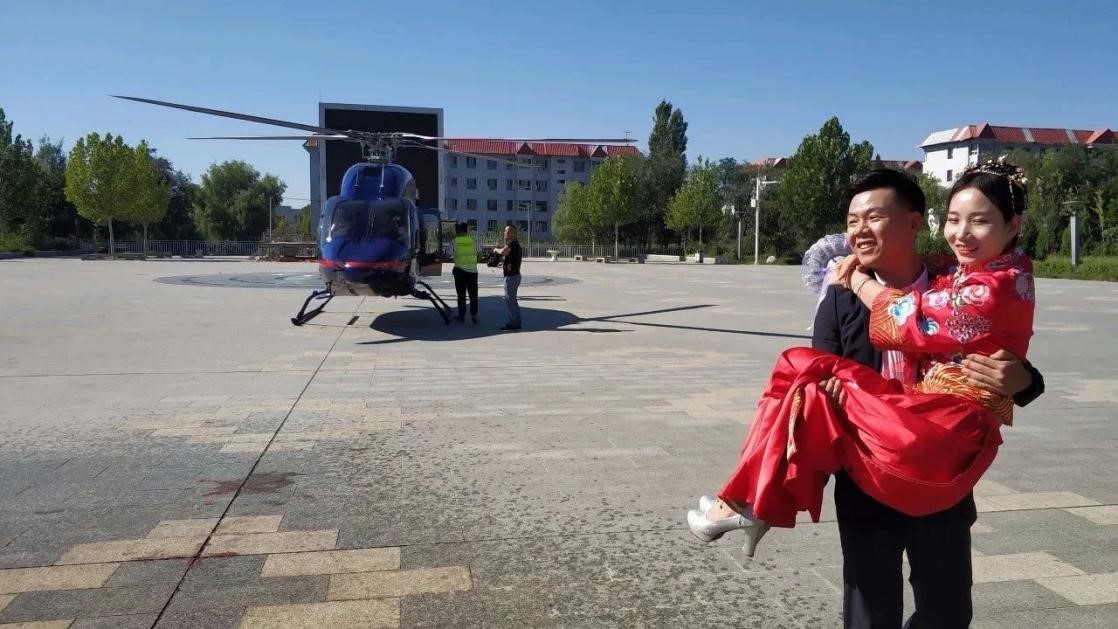 清晨,西亞航空機組在可克達拉草原驛站做航前準備及檢查,隨后,迎來了新人準備登機,天作之合,喜從天降,在六十二團廣場,從直升機上走下來的這對新人,吸引著老百姓驚訝與羨慕的目光,熱鬧的人群等待著新人傾心甜蜜的擁抱。在現場,大家紛紛拿起手機記錄下這一時刻。來自四師62團的張美華(化名)表示,她是頭一次看到直升機接親,讓人很羨慕,希望自己也能用這種方式出嫁。