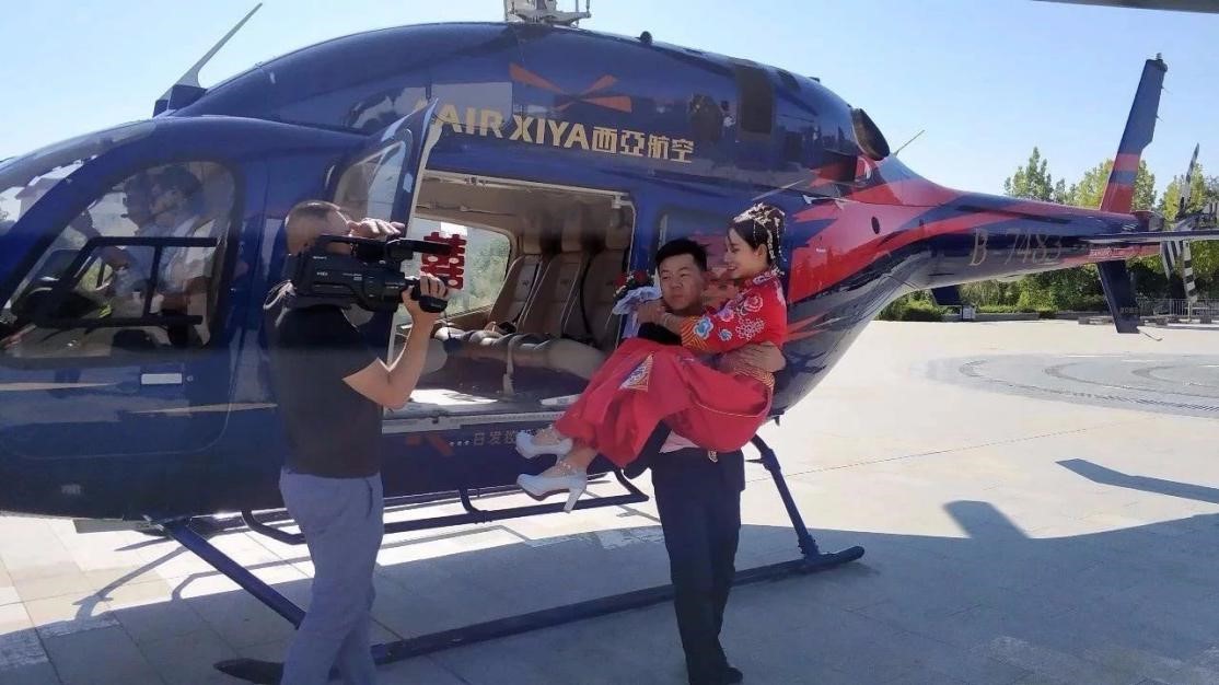 工作人員表示:空中婚禮,直升機接親這種方式,是新時代下的一種消費趨勢,越來越受到新人們的青睞,生活在霍爾果斯的人民很幸福,可以在家門口享受到價值6000多萬的高端直升機接親服務,由霍爾果斯文旅公司負責市場運營,西亞航空執飛。還開通了可克達拉草原驛站至福壽山、圖開沙漠、薰衣草基地的定制航線,為顧客提供空中旅游和婚紗攝影飛行服務。